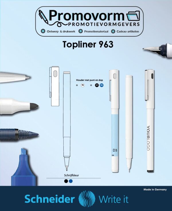 De Schneider Fineliner 963 Recycling is niet zomaar een pen; het is een stap richting duurzame merkpromotie. Kies voor de Fineliner 963 Recycling en maak voor jouw bedrijf milieubewuste promotie. Laat duurzaamheid jouw merk naar nieuwe hoogten tillen met samen met Schneider.