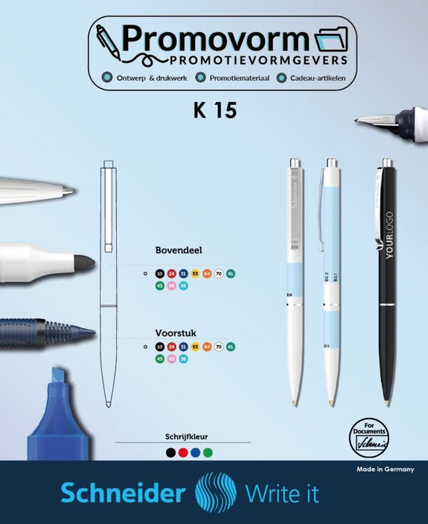 Wat de K15 onderscheidt, is zijn tijdloze innovatieve design. De pen is uitgerust met originele Schneider vullingen die garant staan voor langdurig probleemloos vloeiend schrijven. Er is een ruime keuze uit kleuren van de houder eventueel passend bij uw bedrijfskleur in combinatie met een opdruk voor een geheel eigen uitstraling.
