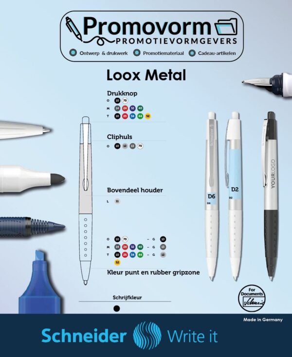 Schneider Loox Metal is niet zomaar een schrijfinstrument maar een symbool van klasse en duurzaamheid, is onderscheidend en zorgt voor een langdurige herkenning van uw bedrijf. Met de Schneider Loox Metal geeft je een geschenk dat niet alleen vloeiend en soepel schrijft, maar draag je ook uw bedrijf positief uit. De keuze van de Schneider Loox Metal als promotiemiddel is dan ook een goede besteding van uw reclamegeld.