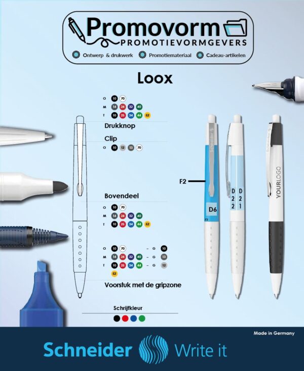 De Schneider Loox is bij elke promotionele actie een waardevolle ondersteuning. Door de duurzaamheid, betrouwbaarheid en de mogelijkheid tot navullen blijft deze pen langdurig aandacht vragen voor uw bedrijf. Geef niet zomaar een pen maar geef een Schneider Loox als investering in een langdurige relatie met uw afnemers.