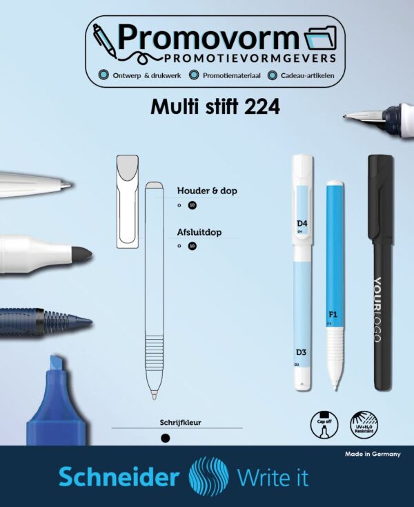 3. Top kwaliteit: De betrouwbaarheid van Schneider-producten en de duurzaamheid van de Universal Marker 224 dragen bij aan de algehele waarde van deze marker als een hoogwaardig promotiemiddel van topkwaliteit..
