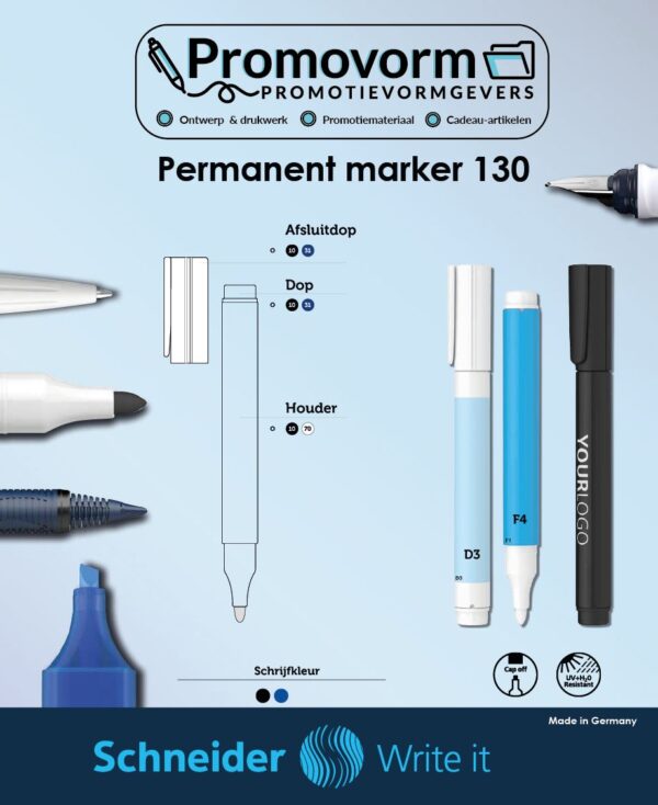 2. Ruime mogelijkheid voor bedrukking: De marker biedt een royale bedrukkingsruimte, waardoor je boodschap en/of bedrijfsnaam duidelijk en prominent kan worden weergegeven. Dit maakt van de Schneider Permanent Marker 130 een krachtig promotiemiddel.