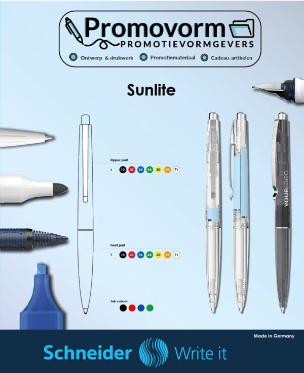 Samenvattend: De Schneider Sunlite is niet zomaar een pen maar een doorschijnende opvallende balpen met uitstekende schrijfeigenschappen. De pen is navulbaar en gemaakt voor langdurig gebruik en dus ook voor een langdurige herkenning van je bedrijf.
